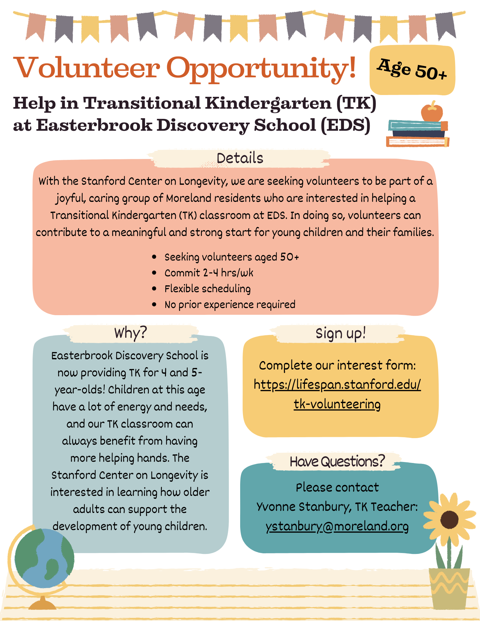 Easterbrook Discovery School (EDS) in San Jose, CA is now providing Transitional Kindergarten (TK) for 4 and 5-year-olds! In partnership with the Stanford Center on Longevity, we are seeking volunteers aged 50+ to be part of a joyful, caring group of Moreland residents who are interested in helping a TK classroom at EDS.